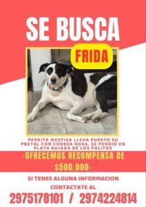 Continúa la intensa búsqueda de Frida, una perrita que se perdió en la zona de Bajada de los Palitos, al sur de Rada Tilly. Su familia anunció que aumentó la recompensa a $500.000 para quienes aporten información concreta que permita encontrarla.