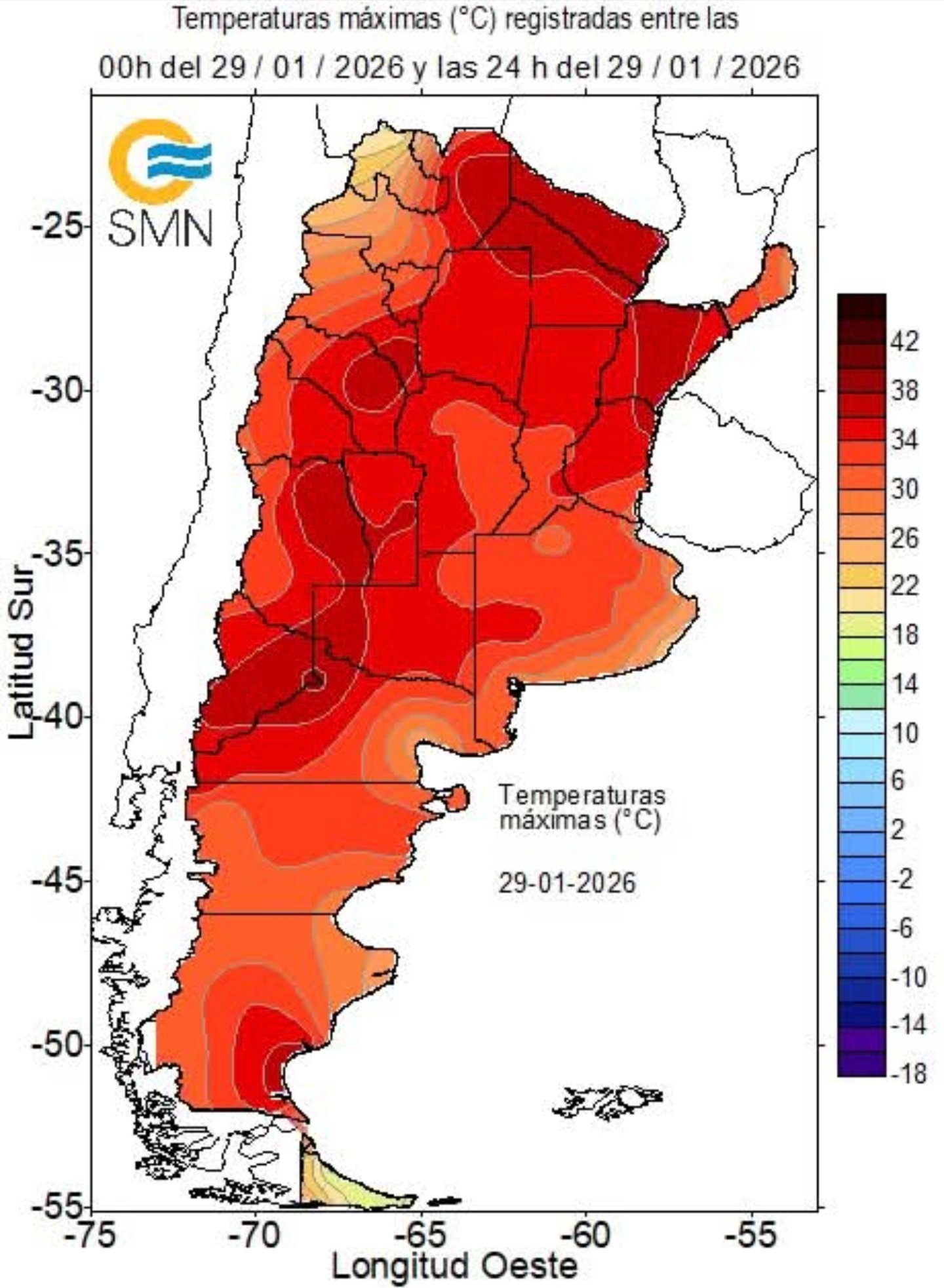 El fenómeno afectó a gran parte del sur del país. Ayer, las temperaturas máximas más altas se dieron en Neuquén (38,6 °C) y San Martín, Mendoza (37,7 °C), seguidas por Chapelco (36,5 °C) y Río Gallegos (36,4 °C). También se destacaron registros elevados en Mendoza, San Rafael, El Bolsón, Trelew y Bariloche, entre otras localidades.