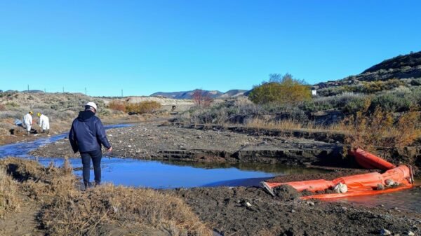 Personal de la Secretaría de Ambiente y Control del Desarrollo Sustentable monitorea las tareas que lleva adelante la empresa YPF para la contención del...
