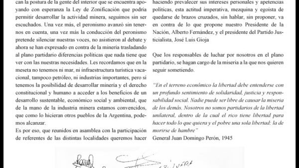 Dirigentes y referentes del Partido Justicialista de varias localidades de la Meseta Central dieron a conocer un documento en el que manifestaron su decepción...