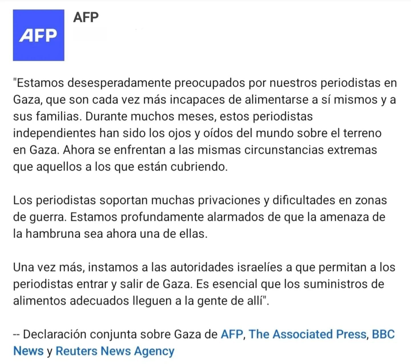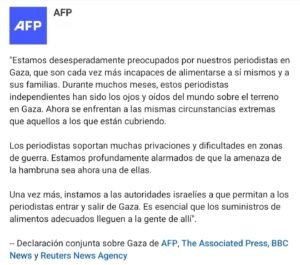 Las principales agencias de noticias del mundo —AFP, Associated Press, BBC y Reuters— emitieron un comunicado conjunto este jueves expresando su “profunda alarma” por la crítica situación humanitaria que atraviesan los periodistas que permanecen en la Franja de Gaza, y reclamaron la entrada inmediata de ayuda alimentaria.