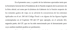 Según surge de la presentación, a partir de informes de la Secretaría General de la Presidencia y de la Jefatura de Gabinete sobre la aeronave y los gastos del viaje, no se verifican los extremos previstos en el artículo 260 del Código Penal ni en otras figuras del Capítulo VII.