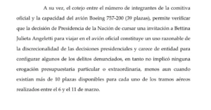 Asimismo, el análisis del número de integrantes de la comitiva oficial en relación con la capacidad del avión Boeing 757-200, con 39 plazas, indica que la invitación a Bettina Julieta Angeleti se encuadra en un uso razonable de las facultades discrecionales de la Presidencia.