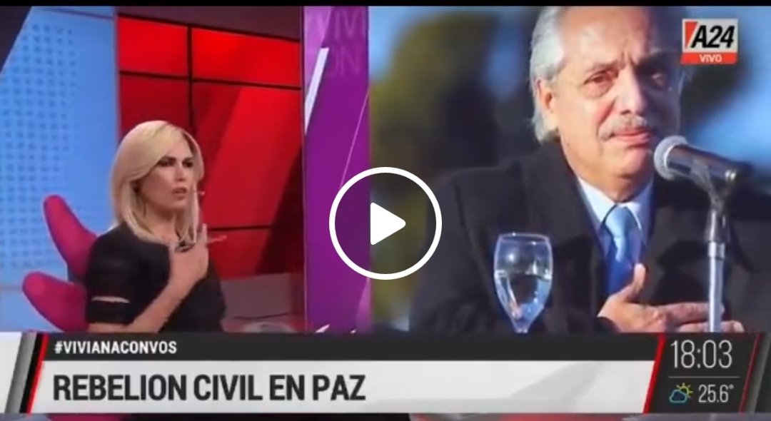 «Tenemos que unirnos los argentinos, no importa de qué lado estés, y decir `basta´ a tantos atropellos, a ser los boludos que pagamos siempre la fiesta de ellos, de meterse con nuestra libertad y nuestro bolsillo. Rebelión civil en paz«, insistió la conductora, sentada en un sillón rojo y con una foto del presidente Alberto Fernández de fondo.