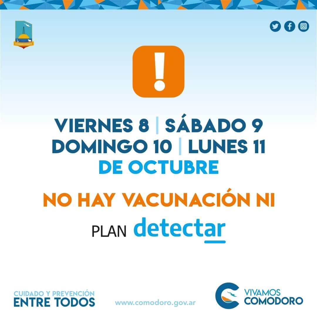 La Municipalidad de Comodoro Rivadavia informó este miércoles que durante el fin de semana largo no habrá vacunación contra el coronavirus ni Plan Detectar en la ciudad, debido a los feriados del viernes 8 y lunes 11 de octubre.
