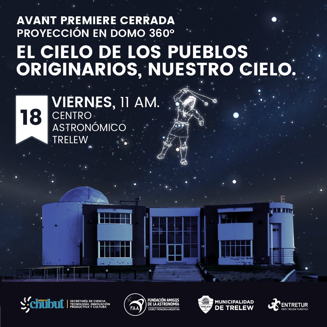 Se trata de un video full – dome 360° que se proyectará en el Centro Astronómico de Trelew y permitirá tener una visión patagónica del cielo y sus estrellas.La Secretaría de Ciencia, Tecnología, Innovación Productiva y Cultura del Chubut, con la colaboración de la Municipalidad de Trelew y de la Fundación Amigos de la Astronomía, con la financiación del Consejo Federal de Inversiones presenta este viernes 18 a las 11:00 horas en el Centro Astronómico de Trelew el audiovisual “El cielo de los pueblos originarios: Nuestro cielo”.