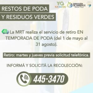 Si podaste y tenés residuos verdes en tu casa debés informar y solicitar la recolección llamando al 445-3470 de lunes a viernes de 8 a 15 hs. Los retiros se realizan sólo los días martes y jueves previa solicitud telefónica.