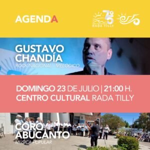 Por la noche los espectáculos que se presentarán a las 21 horas en el Centro Cultural de Rada Tilly son: Gustavo Chandía con un repertorio melódico y de rock nacional con covers y composiciones propias; y luego el Coro de Abucanto que deleitará al público presente con distintas interpretaciones de música popular.