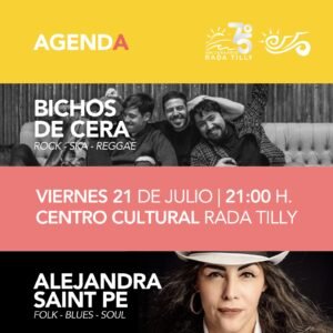 El viernes 21 se presentarán “Bichos de cera” y Alejandra Saint Pé, con dos shows continuados que iniciarán a las 21 horas en el Centro Cultural de la ciudad. Abrirá la noche “Bichos de cera” con un repertorio con fusiones propias que recorren diversas influencias musicales y géneros como el rock, ska, reggae y baladas. Luego será el momento de Alejandra Saint Pé con una puesta musical que invita a profundizar e incursionar en el género pop rock clásico.