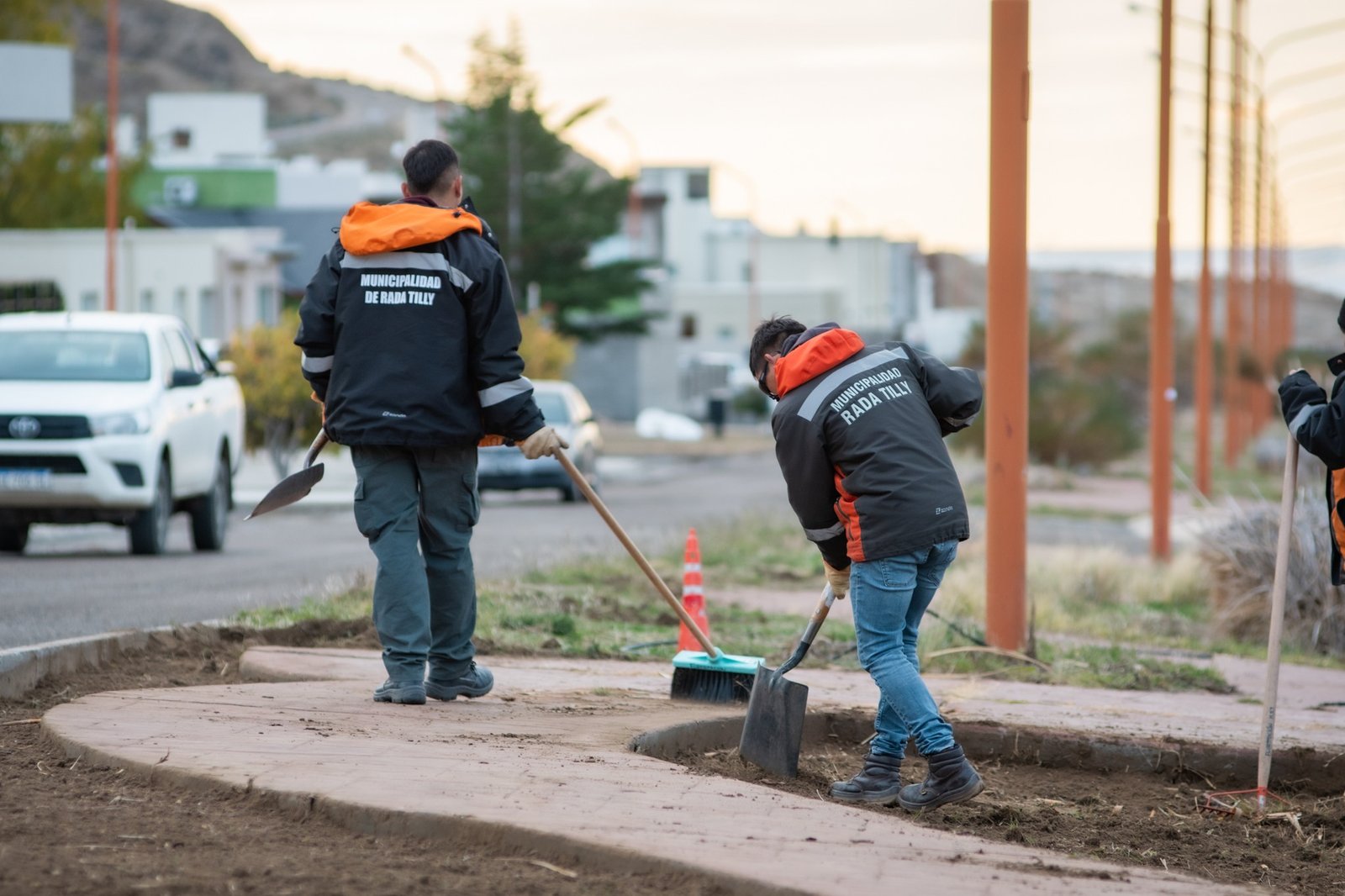 El equipo de forestación del municipio de Rada Tilly está llevando a cabo labores de embellecimiento en el barrio Solares del Marqués.
