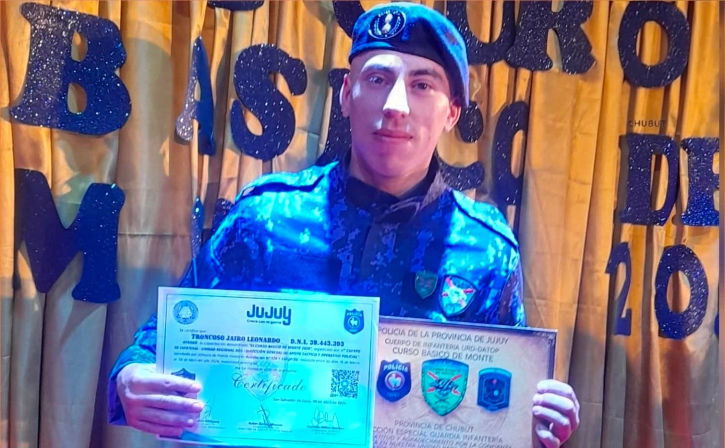 La Jefatura de la Policía del Chubut felicitó al cabo Jairo Leonardo Troncoso, integrante de la Sección Especial Guardia Infantería de Comodoro Rivadavia, tras haber finalizado y aprobado el “XI Curso Básico de Monte” dictado en la provincia de Jujuy.
