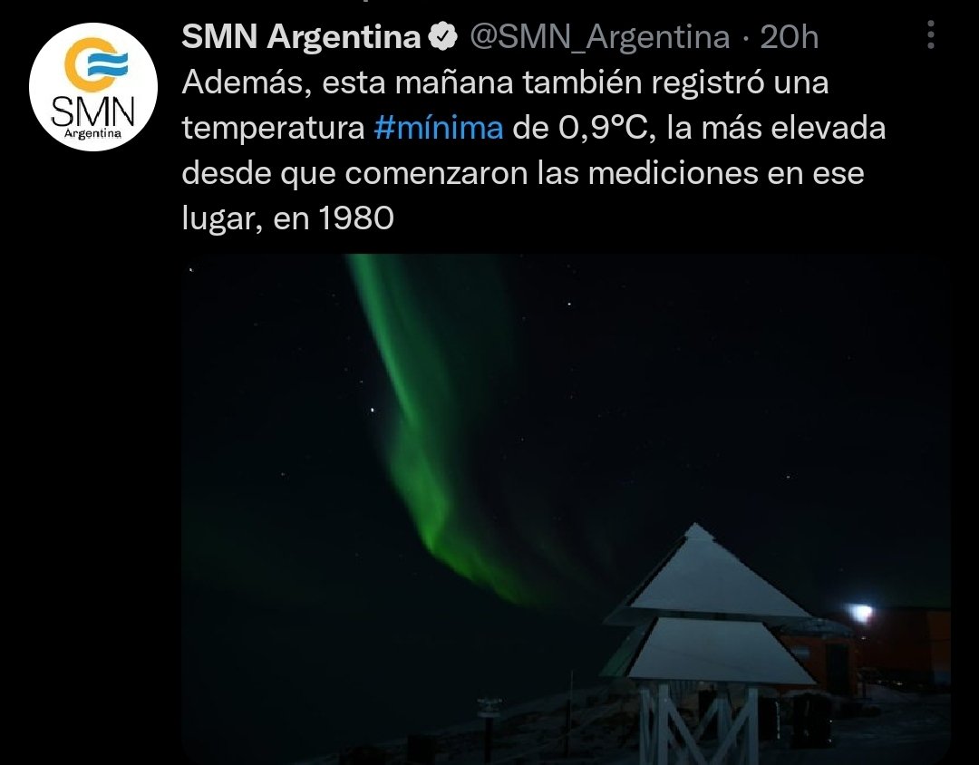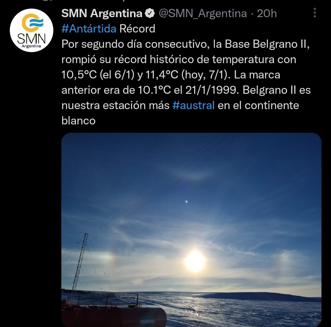 «Por segundo día consecutivo, la Base Belgrano II, rompió su récord histórico de temperatura con 10,5°C (el 6/1) y 11,4°C (hoy, 7/1). La marca anterior era de 10.1°C el 21/1/1999. Belgrano II es nuestra estación más austral en el continente blanco.»