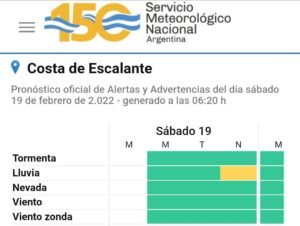 Ante esta situación emitió un alerta meteorológico amarillo para toda la zona de la costa de Escalante, la cuál incluye al aglomerado de Comodoro-Rada Tilly. En él detalla la probabilidad de lluvias de variedad intensidad, y que podrían dejar acumulados de hasta 25mm.