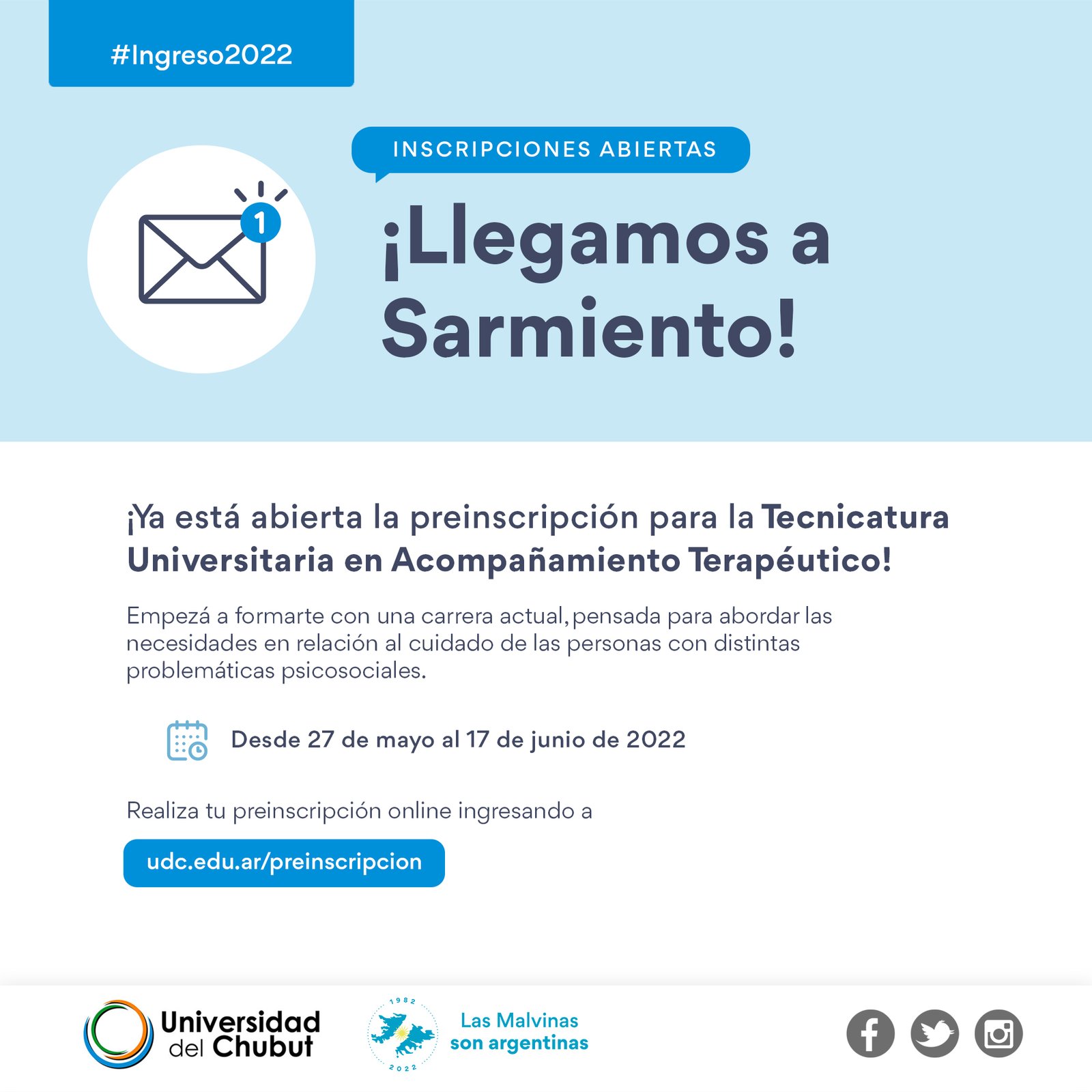 Se extenderá hasta el 17 de junio de 2022. El cursado de la tecnicatura será semipresencial y comenzará el 27 del mismo mes, con el dictado del Programa de Nivelación Universitaria. “Con esta carrera consolidamos la llegada de la Universidad del Chubut a Sarmiento, como un punto central que nos permitirá generar acciones con impacto en toda la zona sur”, aseguró la directora de la Unidad Académica Salud Social y Comunitaria, Marcela Freytes.