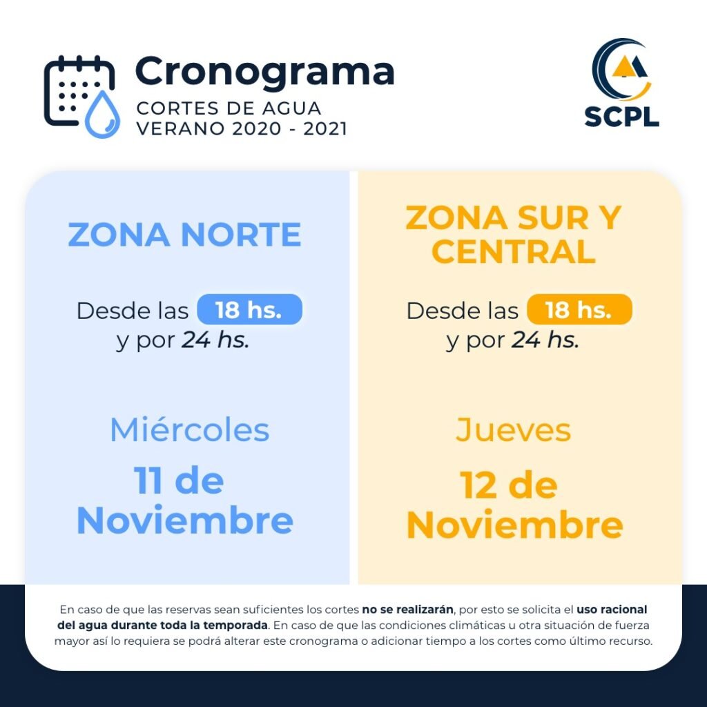 La SCPL informa que inicia el cronograma de cortes de agua programados para recuperar reservas en el Puesto La Mata. De esta manera, se interrumpirá el suministro de agua potable mañana miércoles 11, desde las 18 horas y por 24 horas en Zona Norte y el jueves 12, desde las 18 y por 24 horas en Zona Sur y Central de la ciudad.