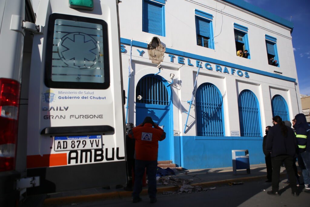 Pasadas las 09 hs se produjo un accidente en el centro de Comodoro Rivadavia. Un escudo que formaba parte de la fachada del Correo Argentino, se desprendió y cayó sobre la humanidad de un transeúnte que circulaba casualmente por el lugar. La pesada estructura golpeó a un hombre en una pierna provocándole una fractura y ademas de golpes en la cabeza y parte del brazo. El sujeto se encuentra en internado en el Hospital Regional.