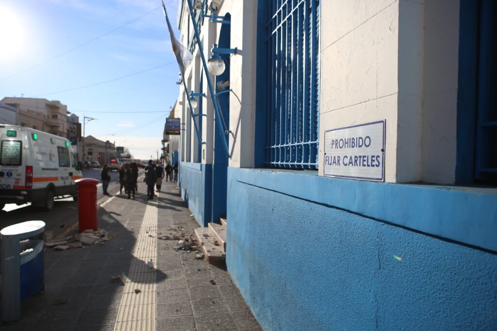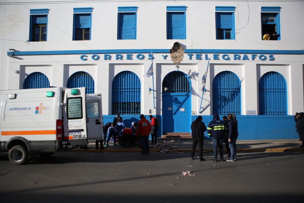 Los restos de mampostería que se cayeron hacie el suelo, se encontraban diseminados a varios metros, alrededor de la puerta de ingreso al Correo.