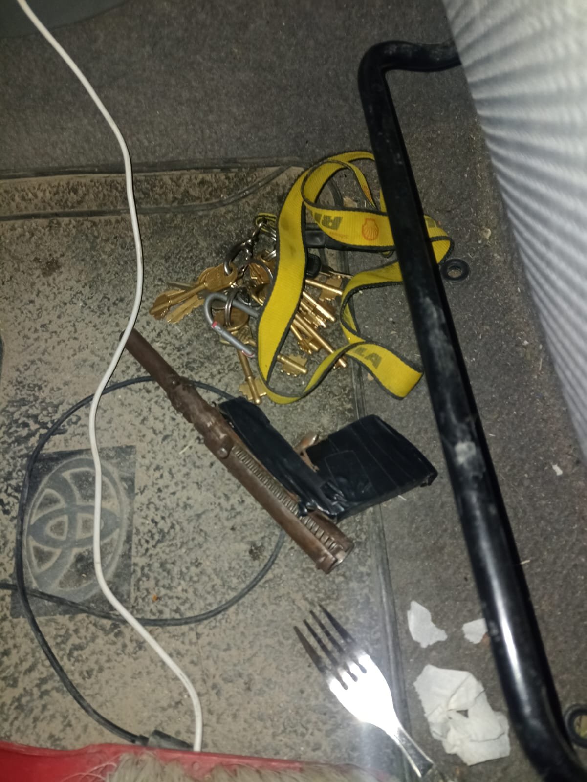 Al intentar despertarlo, los policías descubrieron que el conductor, identificado como Bruno Damián Acosta, no respondía. Al golpear el vidrio de la puerta para llamar su atención, notaron que sobre el suelo del conductor se hallaba un arma de fuego fabricación casera tipo tumbera.