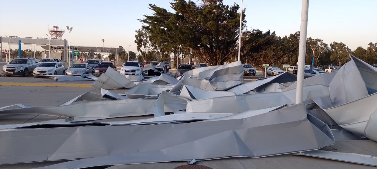 Las chapas del techo se volaron y cayeron sobre el estacionamiento. Por las condiciones climáticas, el aeropuerto se encuentra sin operar con vuelos cancelados y demorados.