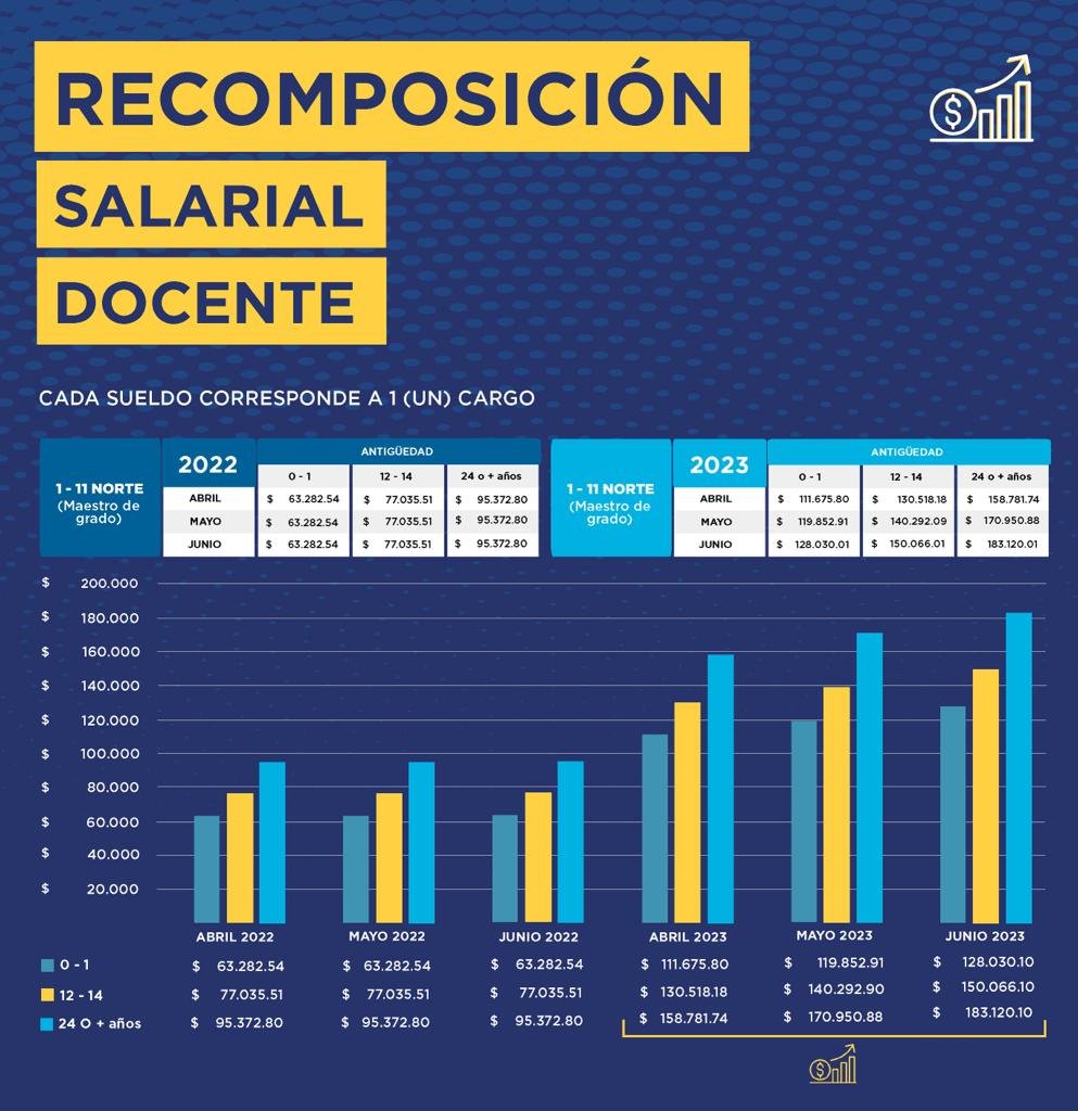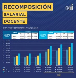 El incremento más sustancial se dio en los docentes de grado que ingresan al sistema educativo: En abril del 2022, percibían un total de $ 63.282 de sueldo; mientras que, en junio de 2023, aumentó a $ 128.030.