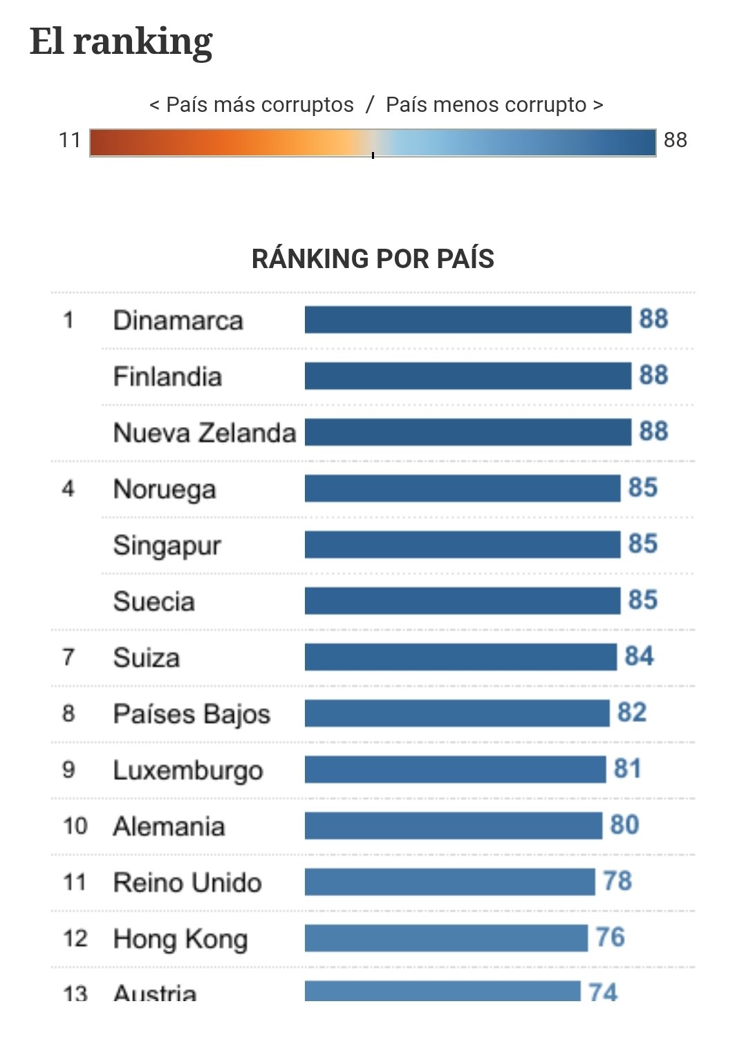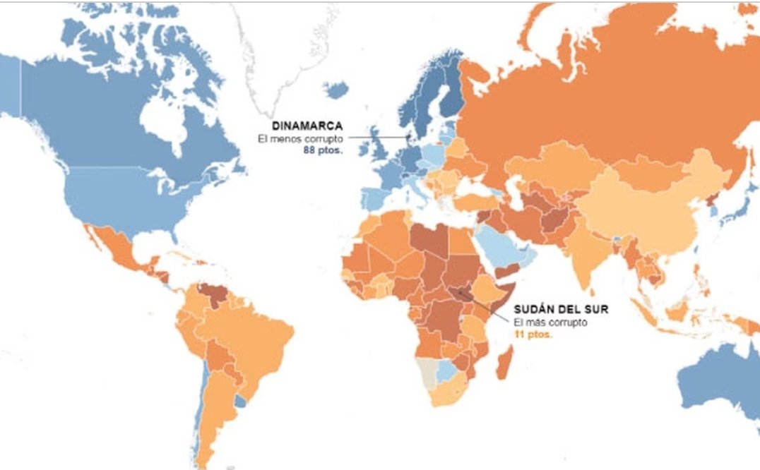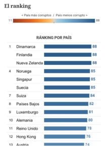 Según publica Infobae, el Índice de Percepción de la Corrupción (IPC) clasifica esa cantidad de países y territorios según el nivel de percepción de la corrupción en el sector público, en una escala de cero para los muy corruptos, a cien, el máximo puntaje para los más limpios.