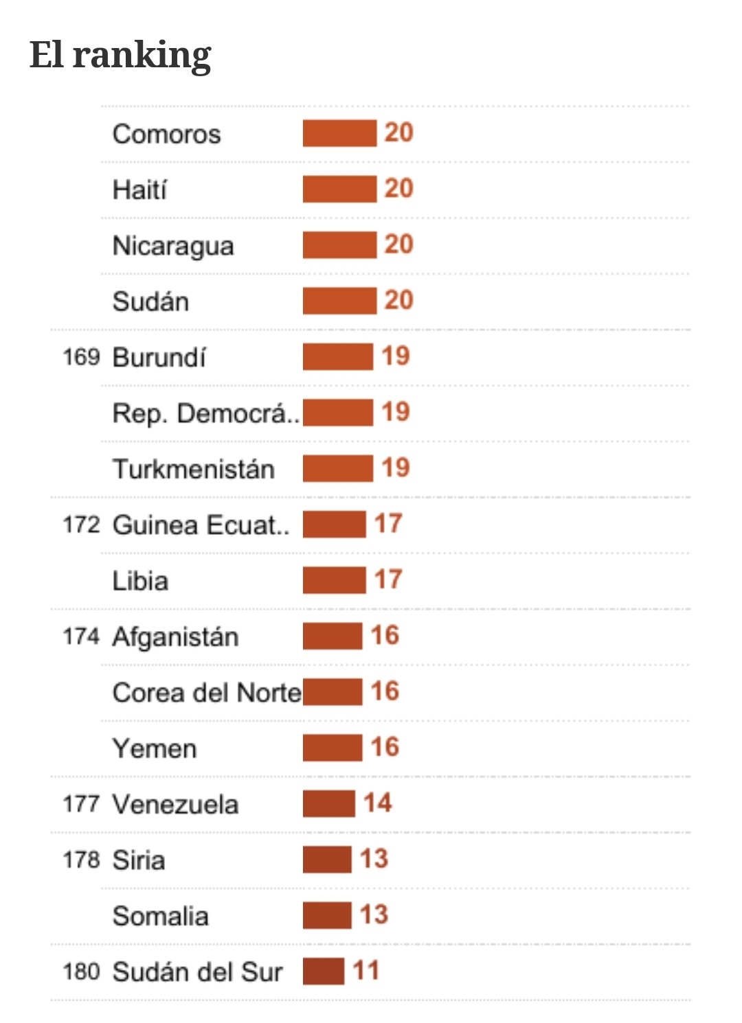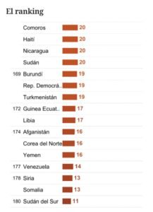 Somalía y Siria, con 13 puntos, y Sudán del Sur, con 11 sobre 100, obtienen de nuevo las puntuaciones más bajas del Índice. Siria es también el último país en materia de libertades civiles.