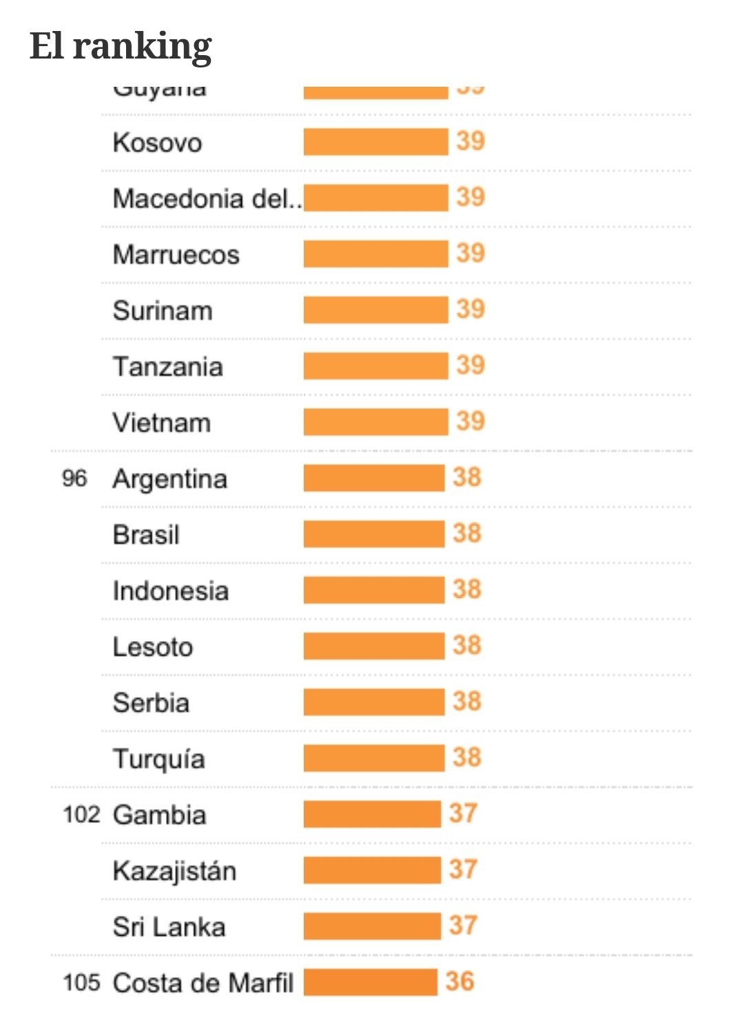 De esta manera retrocedió 18 lugares y se ubicó en el puesto 96 entre 180 países. En 2020, Argentina había obtenido 42 puntos y quedado en el lugar 78 del ranking.