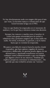 Y añadió: «Siempre hay rumores y muchos usan el nombre de Lionel para ganar notoriedad pero la verdad es solamente una y podemos asegurar que no hay nada con nadie. Ni verbal, ni firmado, ni pactado, y no lo habrá hasta que no acabe la temporada».