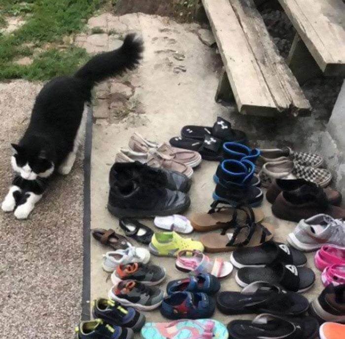 Según relató su dueño, la rutina nocturna del gatito consiste en salir por el barrio, robar algunos calzados de los vecinos y volver a su casa con el botín. El problema es que lo hace todo el tiempo y la colección es cada vez más grande. En un momento llegó a acumular 50, y muchos con el par completo.
