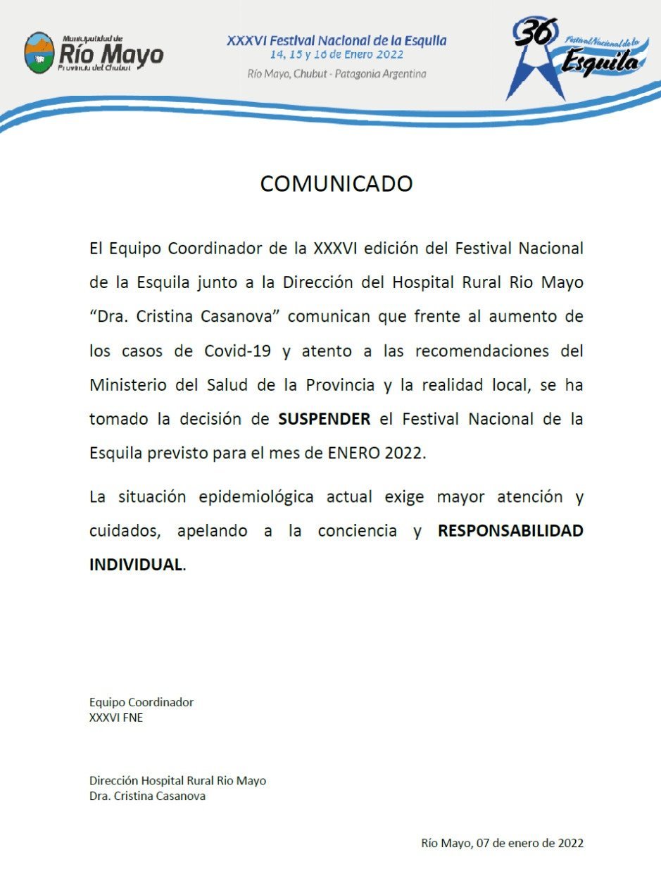 La Municipalidad de Río Mayo a través de un comunicado informó la suspensión del Festival. La decisión se tomó en conjunto con del equipo Coordinador de la XXXVI edición del Festival Nacional de la Esquila y la Dirección del Hospital Rural “Dra. Cristina Casanova”. El evento que estaba previsto para fines de enero de este año.