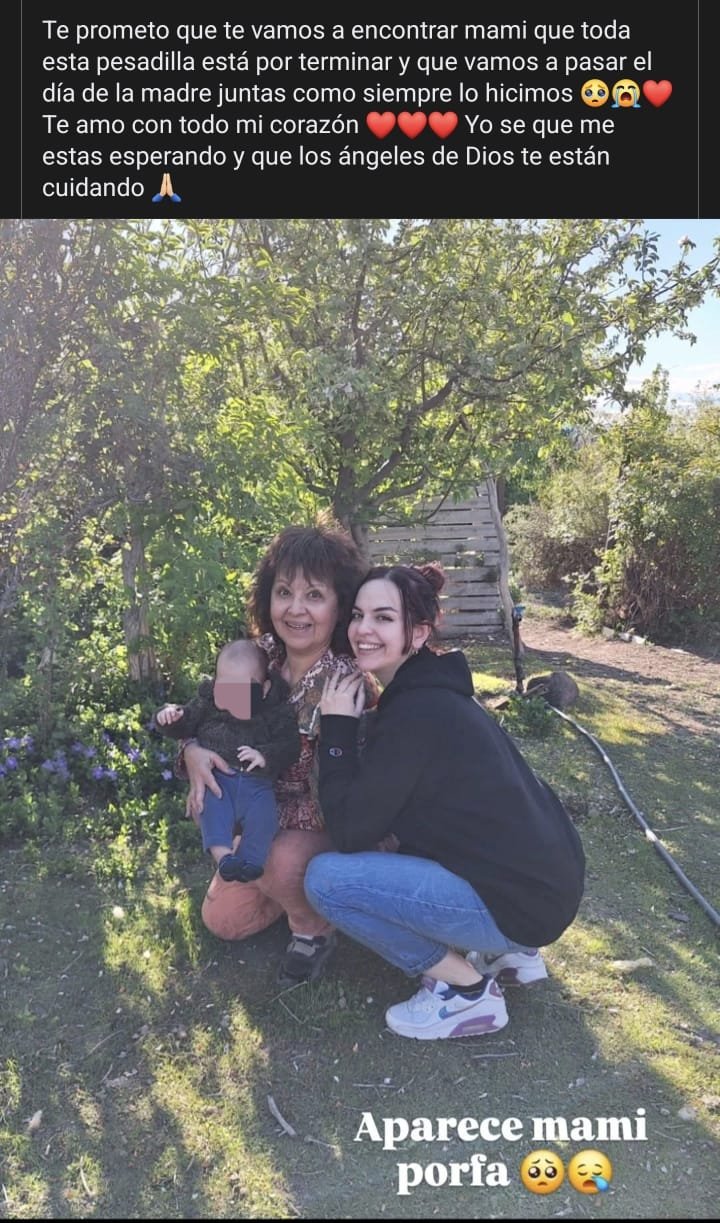 “Te prometo que te vamos a encontrar, mami, que toda esta pesadilla está por terminar y que vamos a pasar el Día de la Madre juntas como siempre lo hicimos. Te amo con todo mi corazón. Yo sé que me estás esperando y que los ángeles de Dios te están cuidando”, escribió la joven en redes sociales, junto a una fotografía familiar en la que se la ve abrazando a su madre.