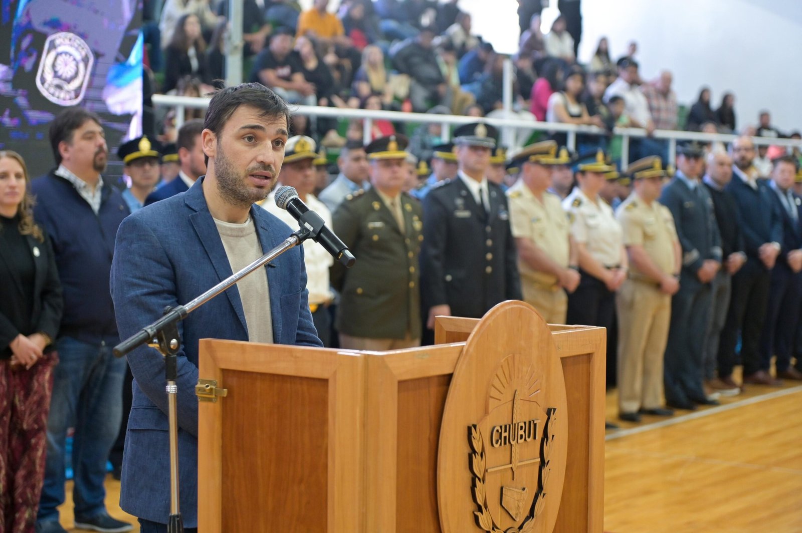 El gobernador del Chubut, Ignacio “Nacho” Torres, participó este lunes del Acto de Ascenso del Personal Superior y Subalterno en Comodoro Rivadavia. La actividad tuvo lugar en las instalaciones del Club Luis A. Huergo de dicha localidad, y acompañaron al mandatario provincial el ministro de Seguridad y Justicia, Héctor Iturrioz; la intendenta de Rada Tilly, Mariel Peralta; la diputada nacional Ana Clara Romero; la senadora nacional Andrea Cristina; el jefe de la Plana Mayor de la Policía del Chubut, comisario Andrés García; el jefe y subjefe de la Unidad Regional de Comodoro Rivadavia, comisario Fredy Armando Vera y Raúl Jones, respectivamente; los directores de Seguridad de la Policía del Chubut, Omar Delgado; de Recursos Materiales, Cristian Cedrón; de Policía Judicial, Eduardo Chemín; y de Acción Social, Claudio Troncoso; el juez penal provincial, Jorge Enrique Odorisio; y el juez federal, Enrique Nicolás Baronetto.