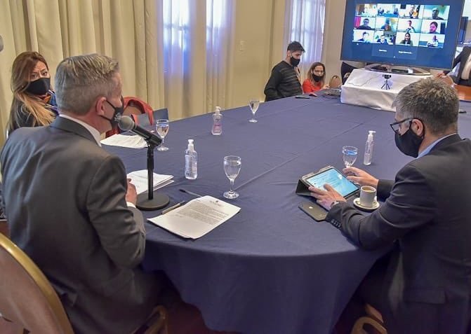El mandatario provincial estuvo acompañado por el ministro de Infraestructura, Energía y Planificación, Gustavo Aguilera y la presidenta de la Administración de Vialidad Provincial, Cynthia Gelvez. A través de la videoconferencia, se hicieron presentes el intendente de Comodoro Rivadavia y presidente del Consorcio de Cooperación del Corredor Bioceánico; Juan Pablo Luque; el ministro de Turismo, Néstor García; el jefe del 13° Distrito Chubut de Vialidad Nacional, Julio Otero; el intendente de Sarmiento, Sebastián Balochi; la jefa comunal de Lago Blanco, Micaela Bilbao y el vicepresidente de la Cámara de Turismo Zona Sur, Antonio Roqueta.