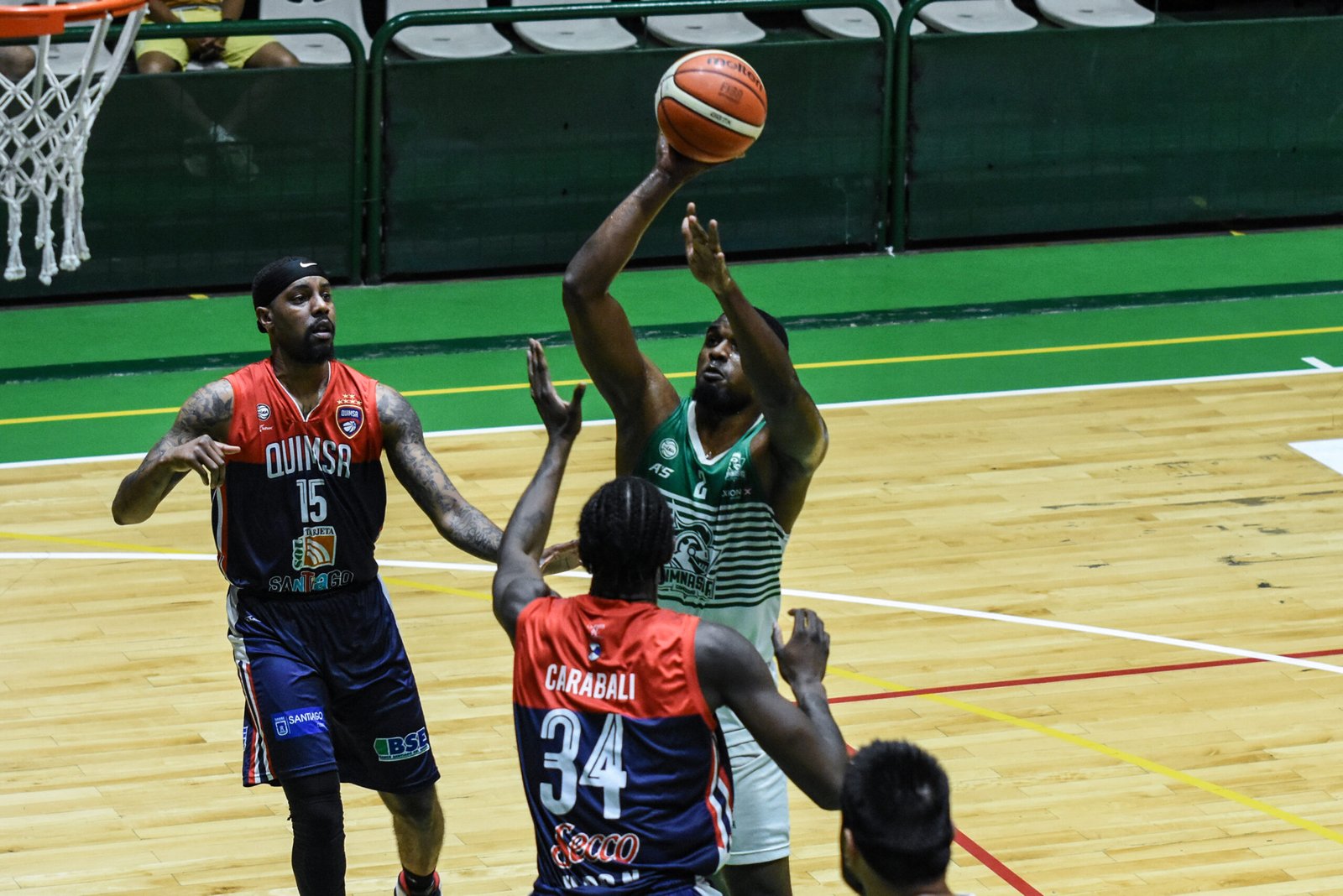 En comienzo Quimsa empezó lastimando con Cosolito para poner arriba 5 a 2. Gimnasia con Mencia en la pintura efectivo para poner 7 a 6. Gimnasia con un movimiento de pelota y Orresta con las penetraciones de Orresta y un triple de Mencia para ponerse 14 a 7 , donde le “ verde esta fuerte en defensa y le hace perder balones a Quimsa.Gaskins descontó 14 a 9, pero Gimnasia con Mencia y Giorgetti aumento la ventaja  otra vez 18 a 9. Baralle con cuatro seguidos achico y termino el cuarto 18 a 14 arriba Gimnasia.