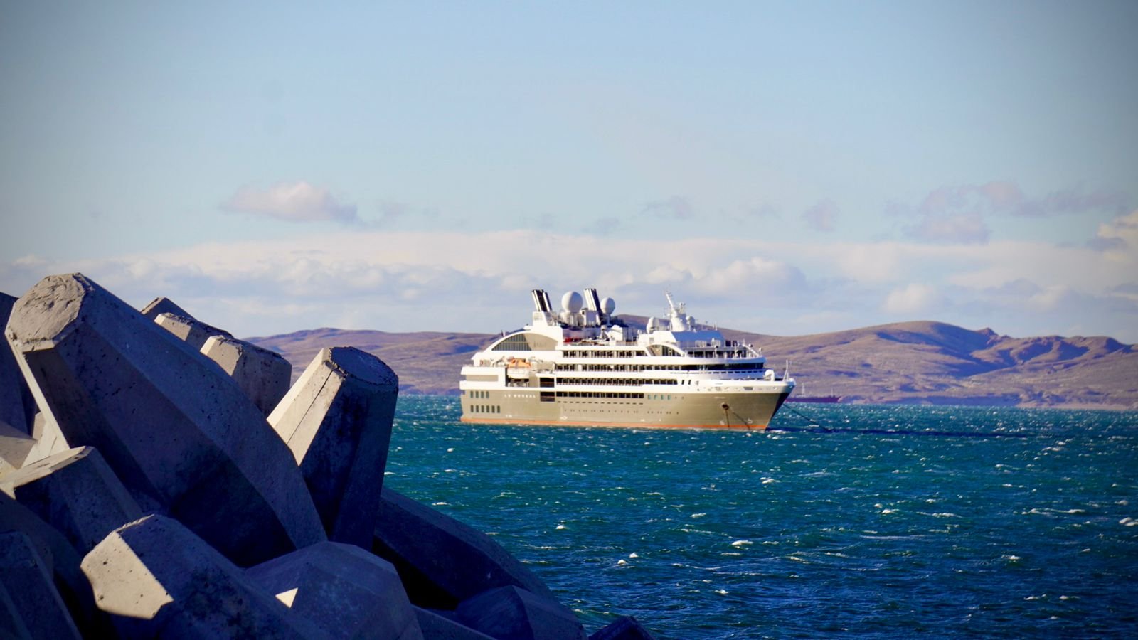 El crucero Le Boreal arribó en horas de la mañana a la Bahía de Camarones luego de haber recalado días atrás en las Islas Malvinas.
