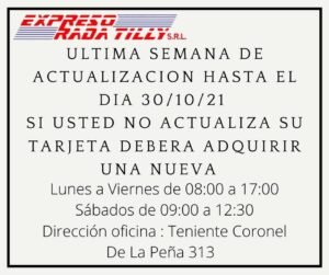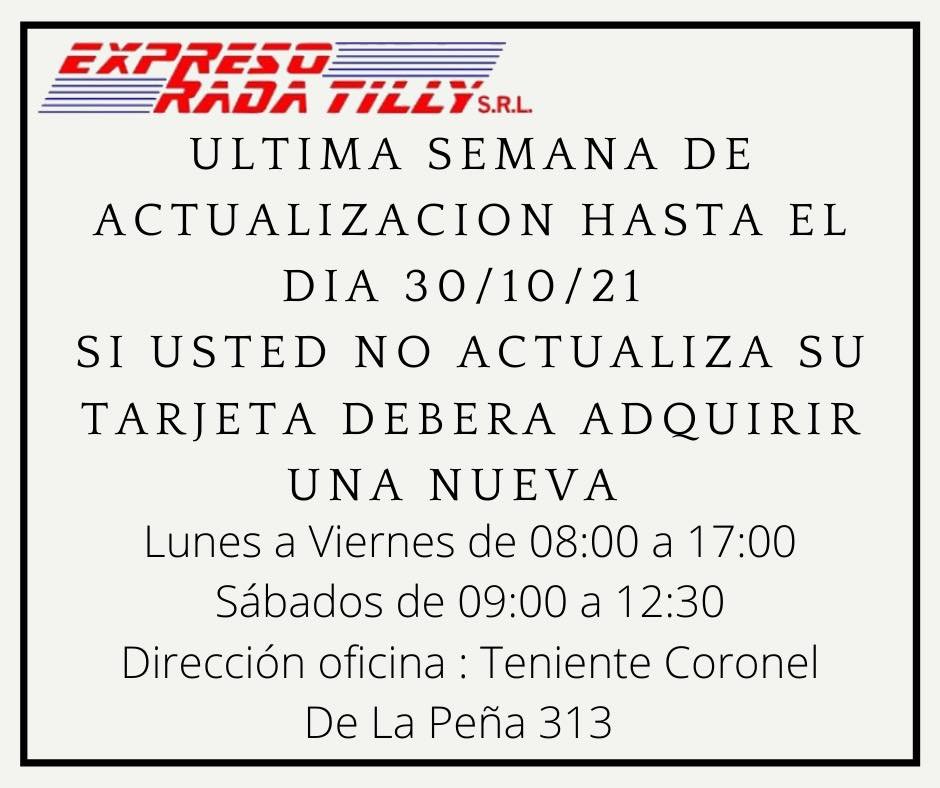 La empresa Expreso Rada Tilly informó a través de sus redes sociales, que esta será la última semana para realizar una actualización de la actual tarjeta, que sirve como único medio de pago para utilizar dicho transporte.