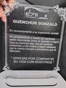Entre las imágenes que acompañaron el mensaje, se destacó el diploma entregado a Gonzalo, con una frase que sintetiza su paso por la institución: “Su perseverancia y pasión por aprender serán recordadas como un ejemplo a seguir”. También apareció el mural pintado en la escuela en su honor, frente al cual posaron sus hermanos.