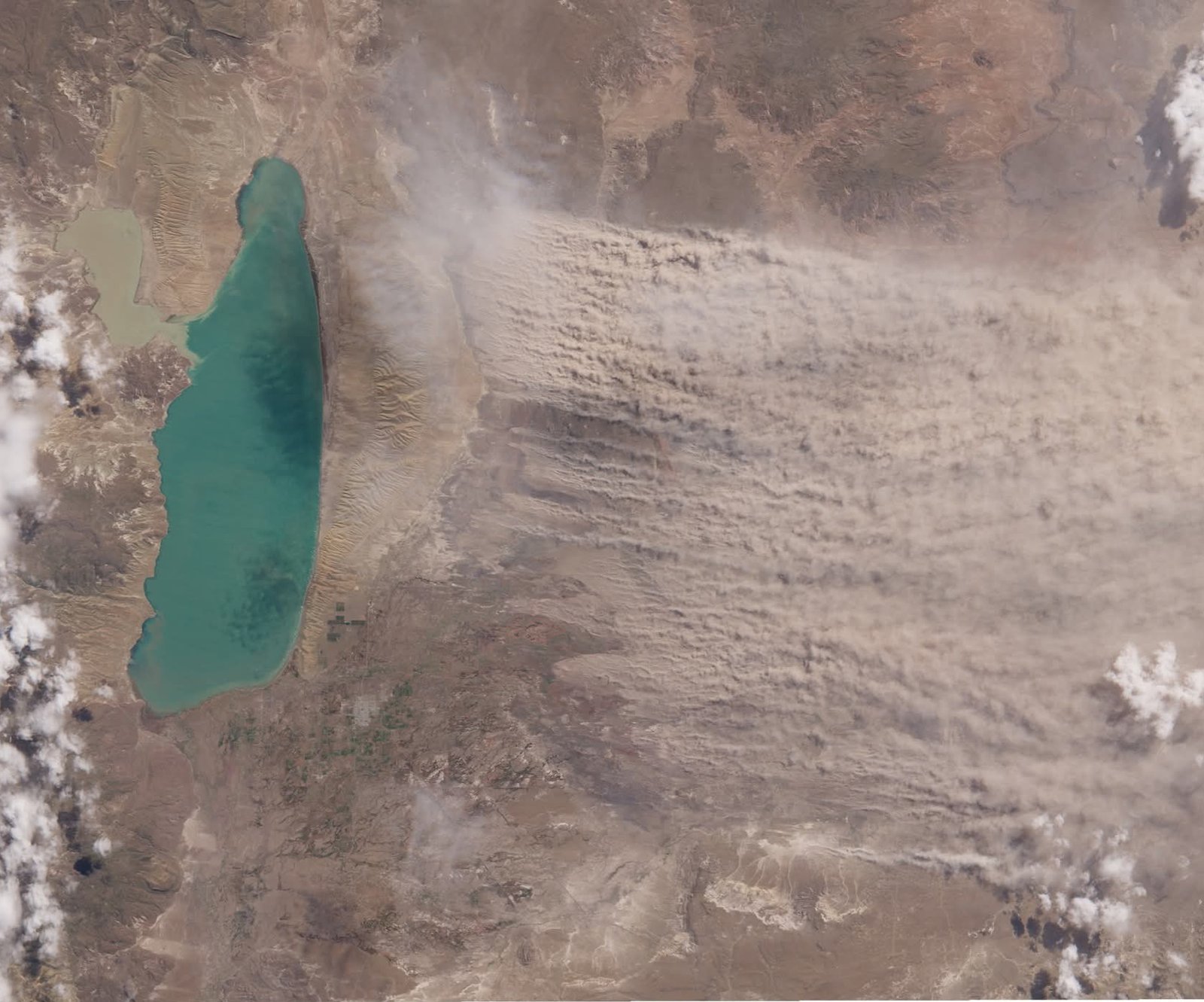 No es la primera vez que imágenes satelitales muestran como las violentas ráfagas de viento levantan los sedimentos del extinto Lago Colhue Huapi.