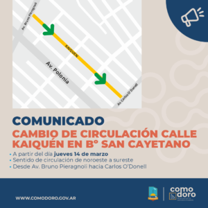 La Municipalidad de Comodoro Rivadavia informó que, a partir del día jueves 14 de marzo, la calle Kaiquen, ubicada en barrio San Cayetano, cambiará su sentido de circulación.
