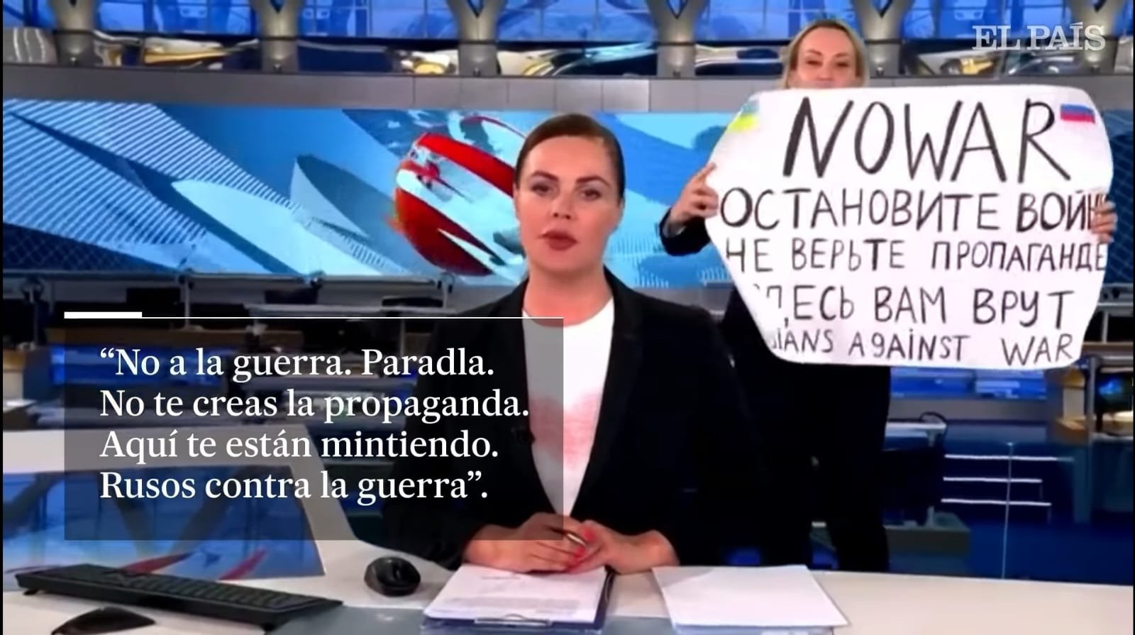 Sin embargo, ayer por la noche Marina Ovsyannikova, directora de programas informativos en el Canal Uno, irrumpió en el vivo del noticiero estatal “Vremia” que es visto por millones de rusos. Allí la periodista apareció detrás de la conductora con un cartel que decía