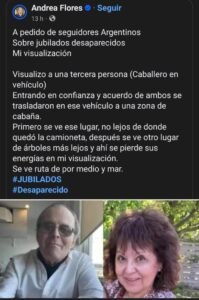 Flores explicó que la revelación surgió “a pedido de seguidores argentinos” interesados en los jubilados. Según su descripción, un hombre en un vehículo habría estado involucrado, acompañando a la pareja en un trayecto que ella percibió.