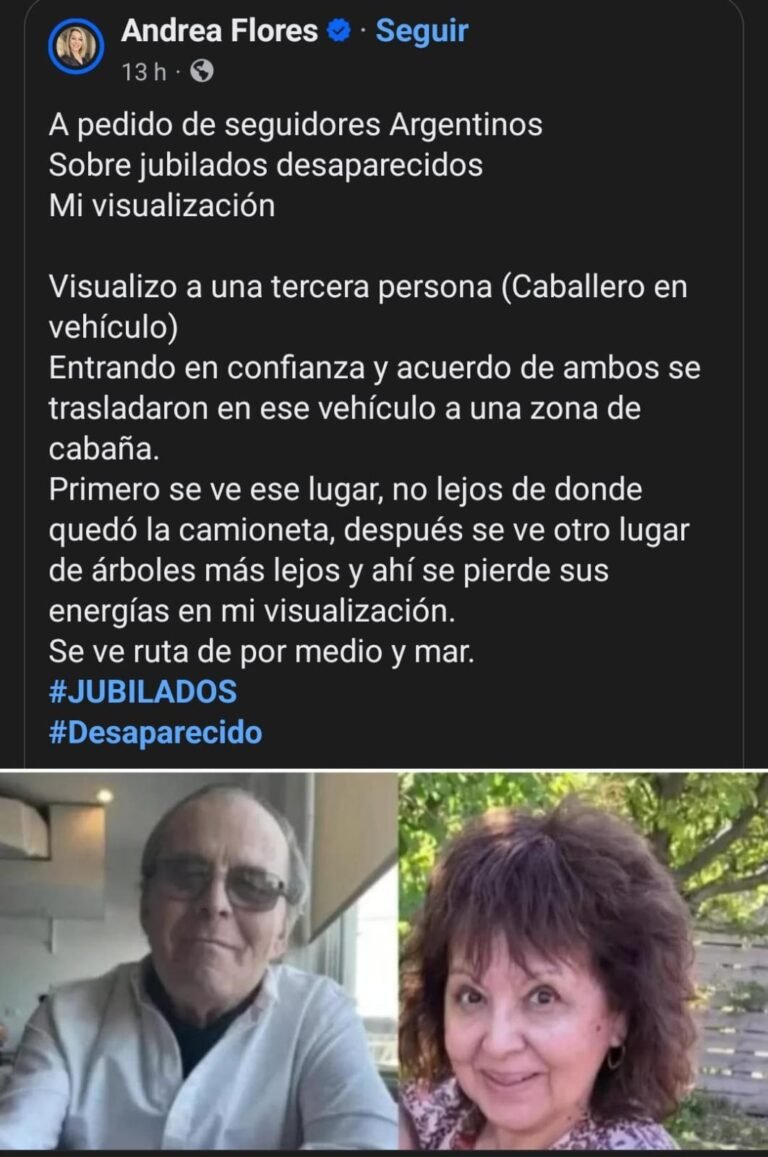 Mientras la desaparición de Juana Inés Morales (69) y Pedro Alberto Kreder (79) sigue sin respuestas, una publicación en redes llamó la atención de la región: Andrea Flores, quien se presenta como vidente, compartió una visualización relacionada con el caso.