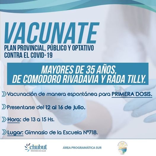 Desde el Área Programática Sur se informó que las personas mayores 35 años de Comodoro Rivadavia y Rada Tilly podrán presentarse de manera espontánea para recibir la primera dosis de la vacuna contra el coronavirus.