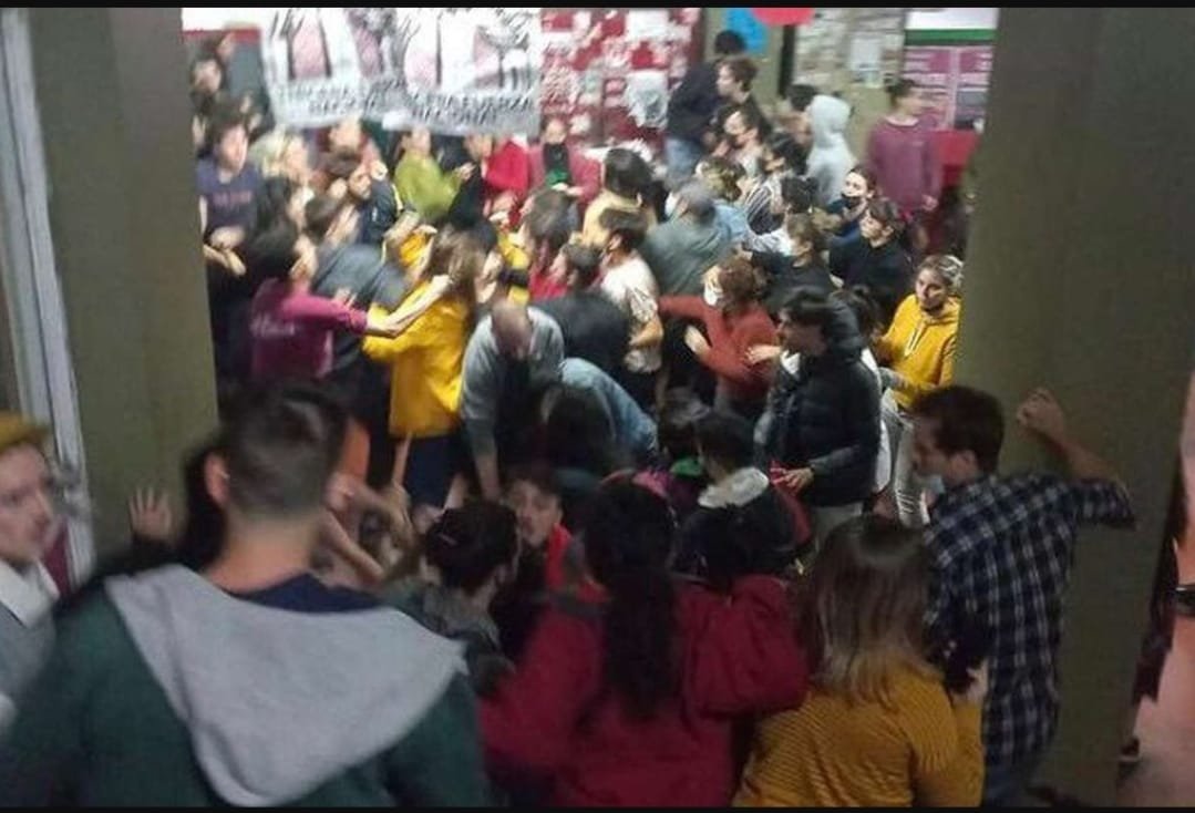 En las redes sociales circulan videos en los que se ve a los militantes peleándose con golpes de puño, al tiempo que hombres y mujeres intercambian cruces físicos y verbales. También se ve cómo uno de los involucrados arroja un bidón de agua a otro estudiante.