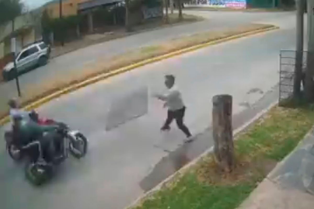Un comerciante no dudo en intervenir con lo primero que tenía a mano para ayudar a un joven que intentaban robarle la moto. Con una reja terminó golpeando a los delincuentes que cayeron de la moto.