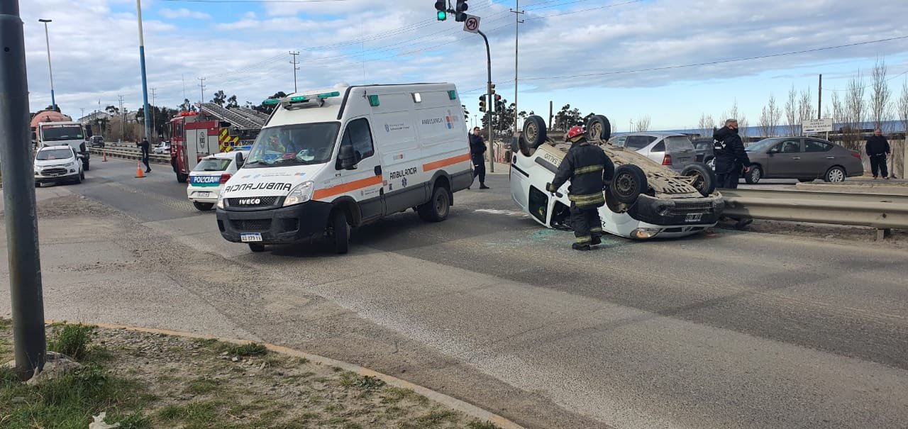 Hace instantes se produjo un vuelco sobre la Ruta 3, frente al Corralón Municipal. Por motivos que se desconocen, el conductor de una camioneta Renalut Kangoo perdió el control del rodado y volcó sobre la cinta asfáltica.