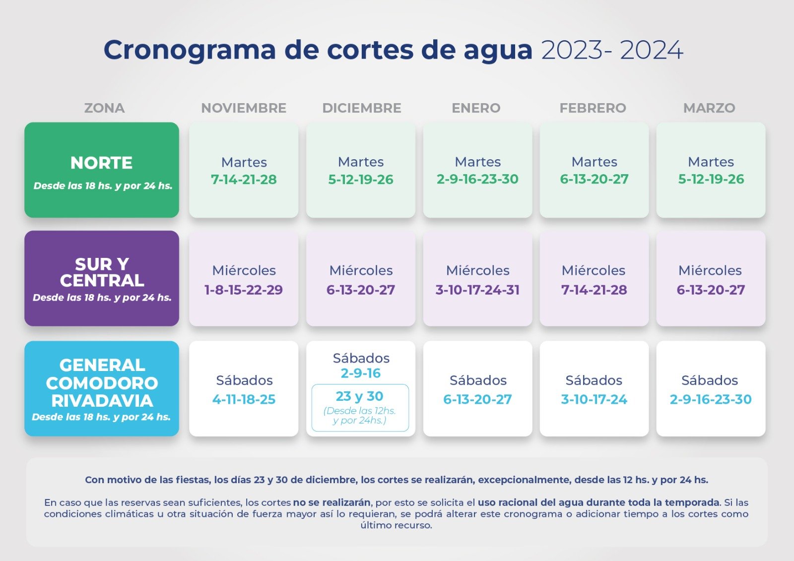 Luego de la seguidilla de cortes de agua por diversas roturas en el acueducto, hoy martes 28 de noviembre se retoma el cronograma de suspensión del servicio correspondiente a la época estival.