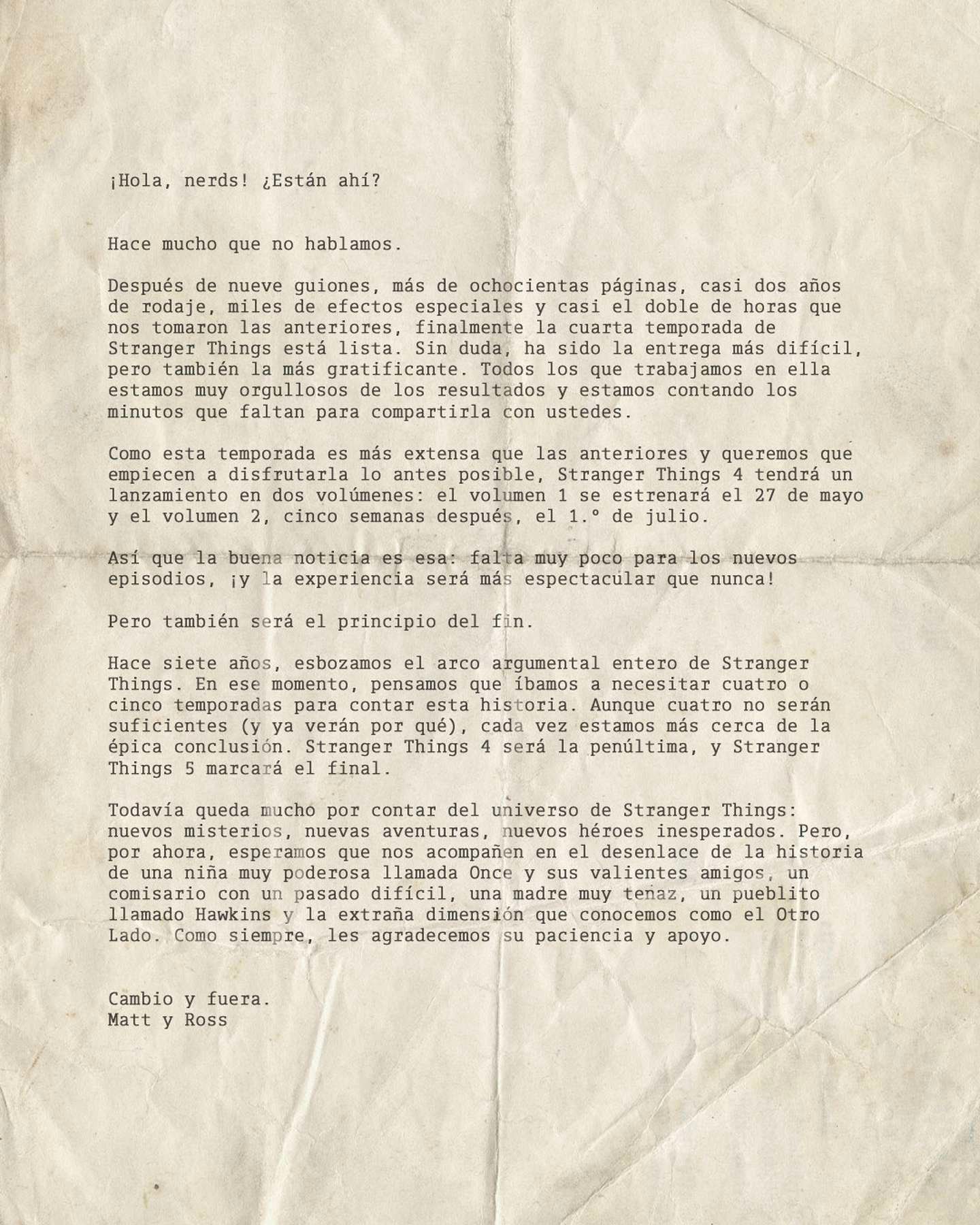 “Hace siete años, esbozamos el arco argumental entero de Stranger Things. En ese momento, pensamos que íbamos a necesitar cuatro o cinco temporadas para contar esta historia. Aunque cuatro no serán suficientes (ya verán por qué), cada vez estamos más cerca de la épica conclusión”, anunciaron.