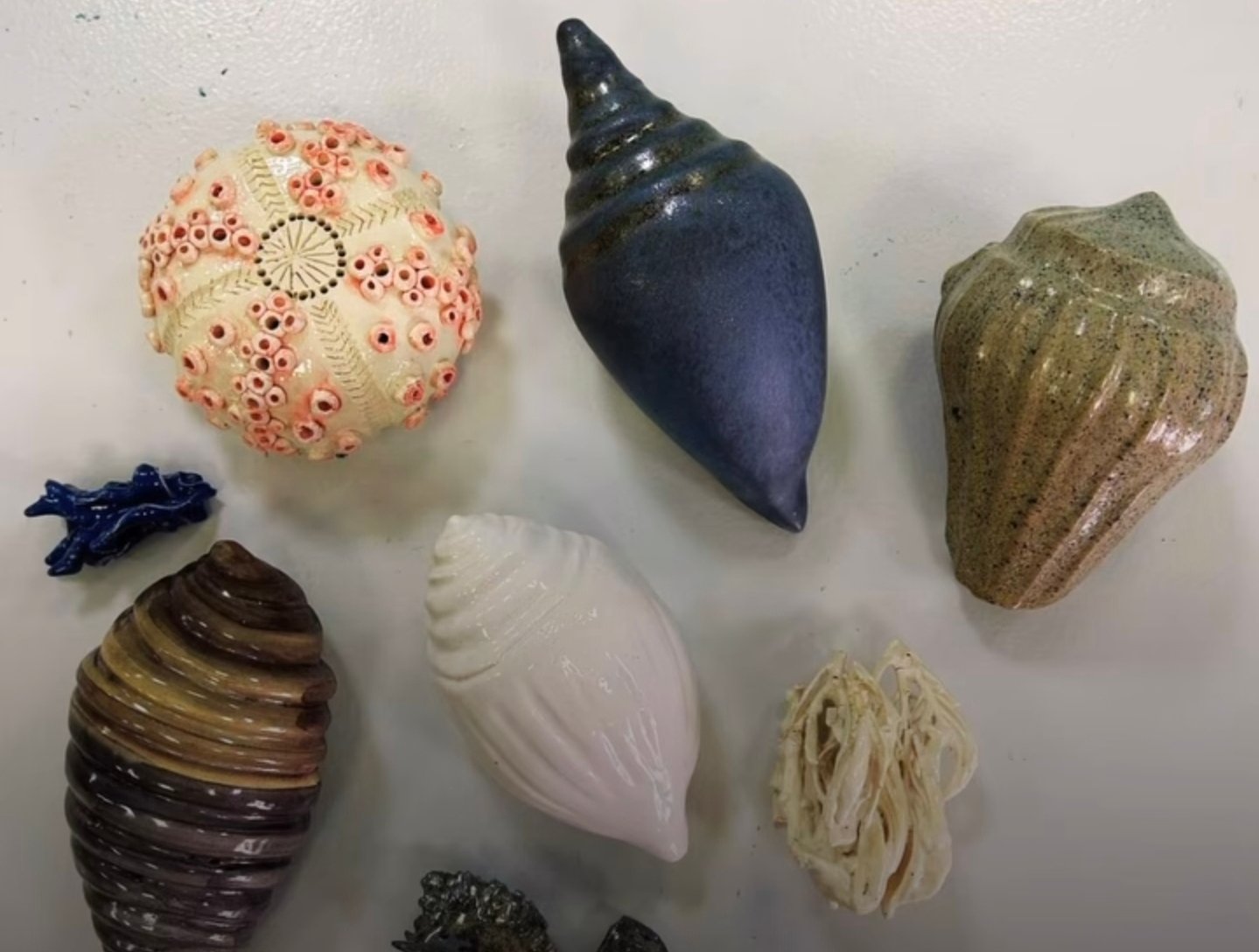 Las obras incluyen cerámica, texturas y composiciones que toman al mar como eje creativo, producto de un año de exploración colectiva dentro del taller.