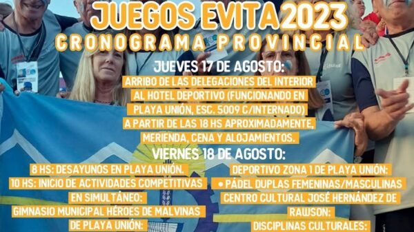 Chubut Provincia informa que ya se encuentra disponible el cronograma de actividades para los Juegos Evita de Personas Mayores 2023 El Gimnasio Municipal de Playa Unión será la sede de la apertura, que se realizará el viernes 18 de agosto a las 19 horas. Redaccion Santi15 agosto 2023